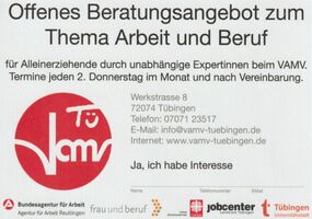 Das Angebot wurde unter Mitwirkung des VAMV von der AG Arbeit des Runden Tisch Kinderarmut der Stadt Tübingen entwickelt und ist unabhängig, unverbindlich und kostenlos.